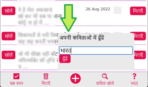 गीत गतिरूप का काफी उपयोग करने पर आपकी कई कविताओं के रिकॉर्ड गीत गतिरूप में जमा हो जाते हैं। तब उनमें से कुछ कविताओं को कुछ शब्दों के आधार पर ढूँढने के लिए, कविताओं की सूची में नीचे सर्च आयकन क्ल्कि करें --