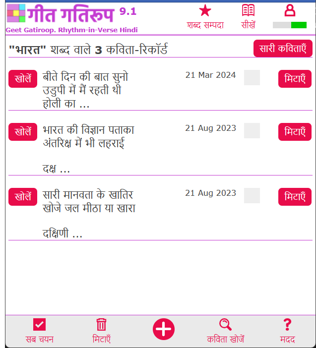 जिन रिकॉर्ड में दिए गए शब्द मिलेंगे, उसकी सूची मिलेगी। जैसे यहाँ, मेरी कविताओं के तीन रिकॉर्ड में 'भारत' शब्द मिला --