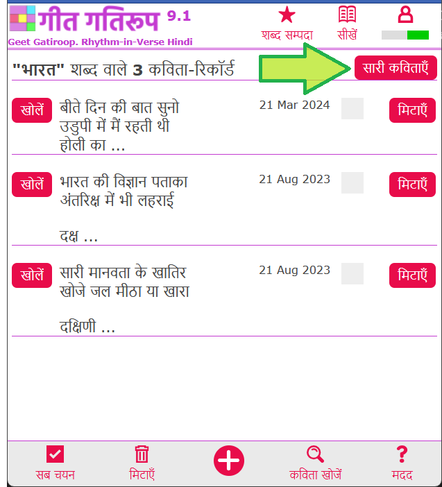 पुन: सारी कविताओं के रिकॉर्ड की सूची देखने के लिए "सारी कविताएँ" बटन पर क्लिक करें
