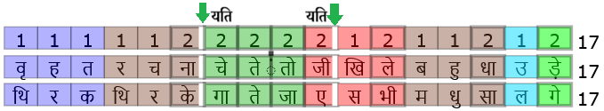 हर पंक्ति में कुल 17 वर्ण हैं। पंक्तियों में क्रमश: एक नगण (१११), एक सगण (११२), एक मगण (२२२), एक तगण (२१२), फिर एक सगण (११२) और अन्त में एक लघु और एक गुरु वर्ण हैं।